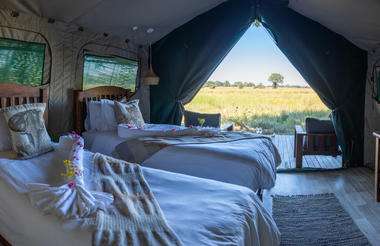 - 3 Nights Moremi, Our Sahara tents are big and comfortable, (L x W x H): 5.6 x 2.9 x 2.5 m, large Tents with ensuite facilities, comfortable beds